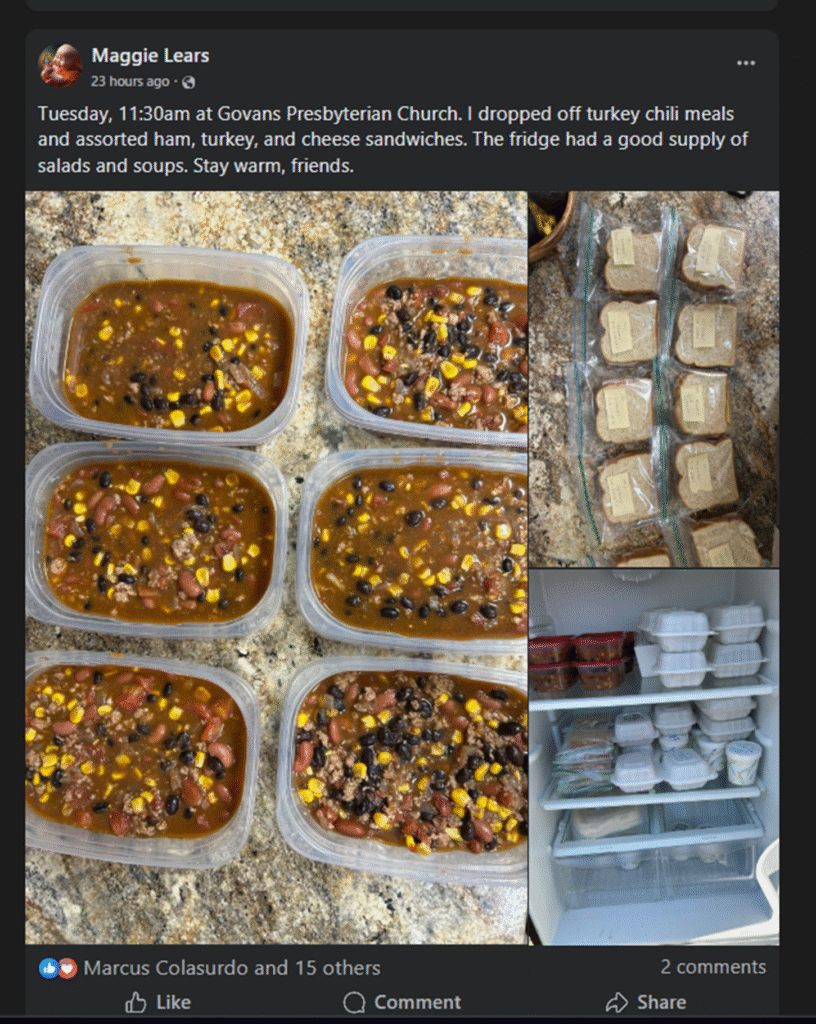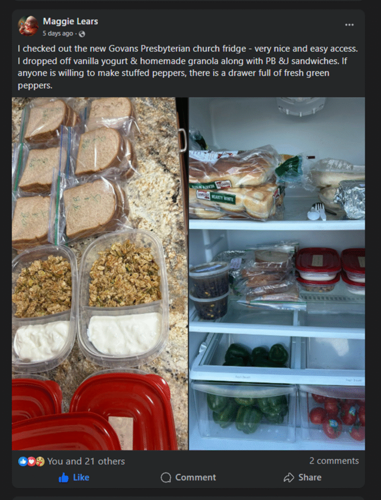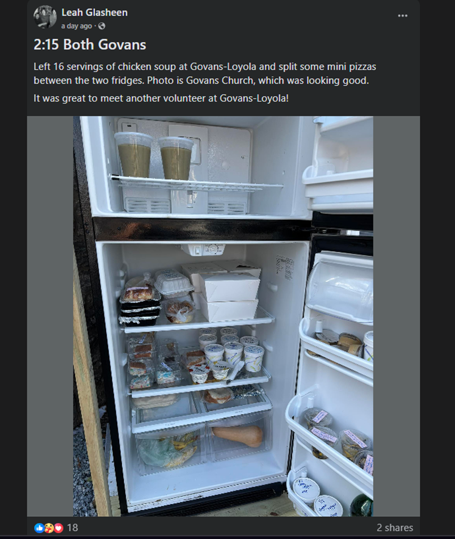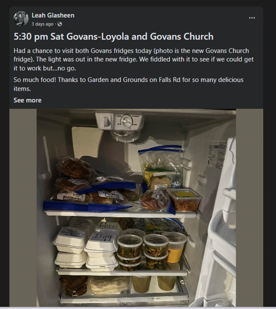 - 28 meals placed in two community fridges (Govans/Loyola & Fulton Street)