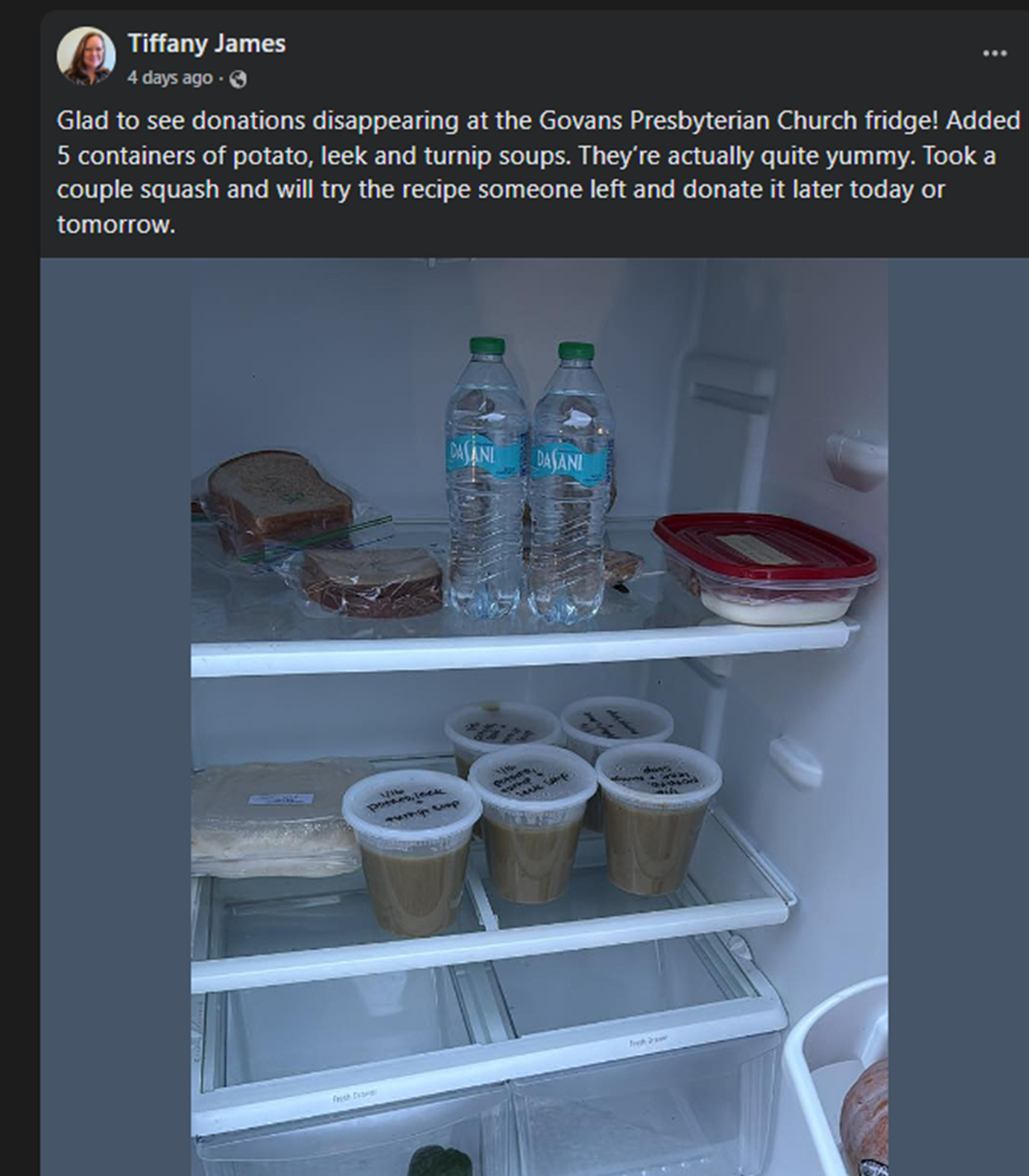 - Potatoes and turnips from the church’s kitchen fridge were used to make 2 containers of potato, leek, and turnip soup and distributed to Govans Loyola fridge (Tiffany)