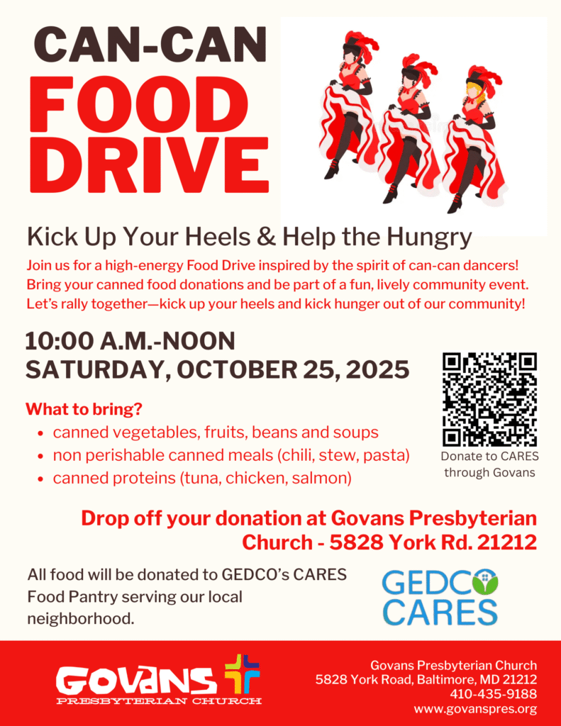 This year, we’re also adding a “Can-Can Food Drive” at the church on Saturday morning. If you can’t join the neighborhood pickup, swing by the church between 10:00 a.m. and noon to drop off your donation.