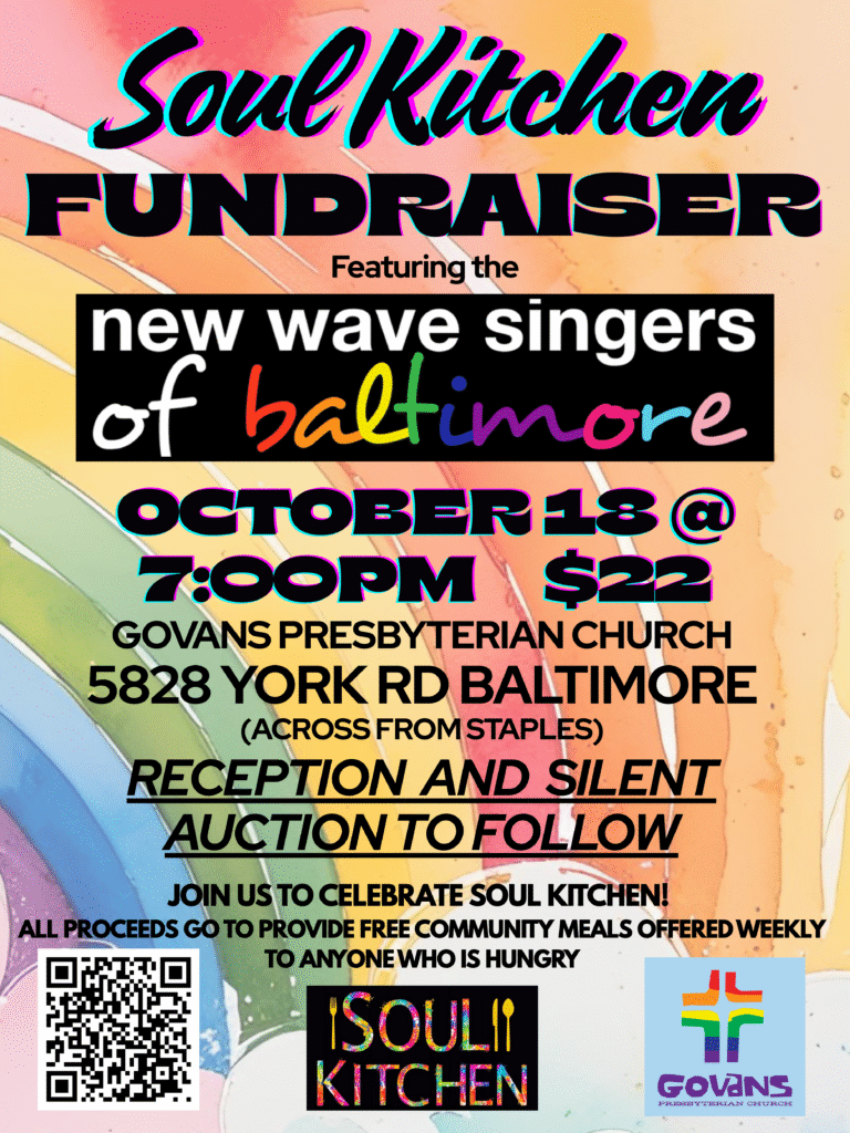 Join us for a special Soul Kitchen Fundraiser on Saturday, October 18 at 7:00 p.m. featuring a performance by the New Wave Singers of Baltimore. Stay afterward for gourmet appetizers and a silent auction, all to support the work of Soul Kitchen.